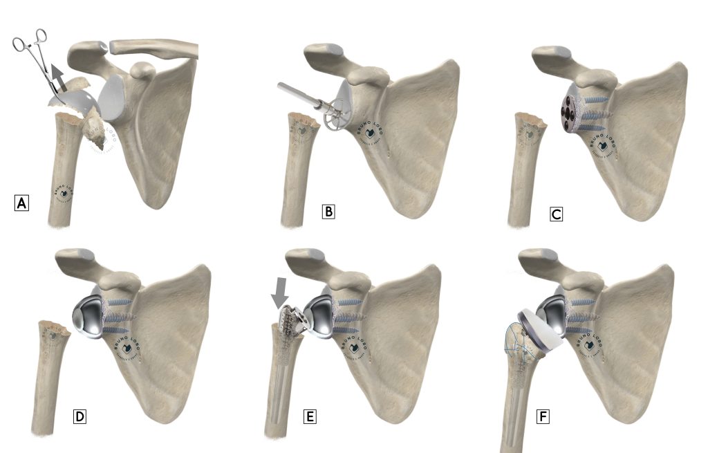 Ilustração mostrando a técnica cirúrgica na artroplastia reversa do ombro para o tratamento das fraturas complexas da extremidade proximal do úmero. Inicialmente os fragmentos da cabeça umeral são retirados (A). A glenóide é preparada (B), para colocação de uma base fixa com parafusos (C) onde se encaixa a glenosfera (D). A haste é introduzida no úmero (E), os componentes posicionados para o encaixe final da articulação e os tubérculos amarrados ao redor da prótese (F).