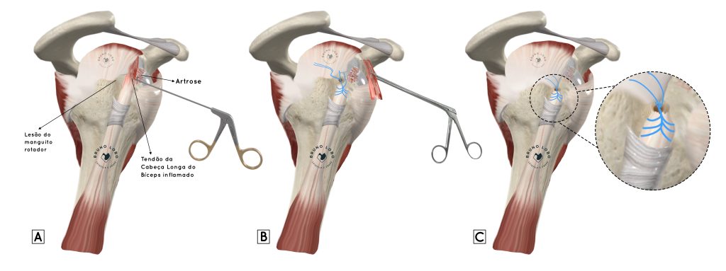 Na artrose do ombro, é imprescindível definir quais são as estruturas acometidas para uma correta abordagem de cada um dos problemas. Na maioria das vezes, a cápsula está envolvida e portanto devemos realizar a liberação da cápsula e resseção do tecido fibrótico que impede o movimento articular. Quando o bloqueio de movimento é gerado por uma impacto mecânico decorrente de um osteófito ou um pequeno fragmento ósseo de uma fratura mal reduzida, o tratamento envolve a ressecção deste bloqueio. Isto é realizado com um aparelho semelhante à uma broca de desgaste usada pelos dentistas, com um aspirador acoplado para sugar o pó de osso gerado. Este instrumento permite ao cirurgião esculpir novamente região, eliminando o bloqueio ósseo. No caso do ombro, frequentemente existe um grande osteófito na região inferior da cabeça umeral. Esta é uma estrutura de difícil acesso devido à sua intima relação com o nervo axilar, que tem uma importância primordial na função do ombro. Desta forma, pode não ser viável a retirada completa deste osteófito por via artroscópica com segurança. Eventualmente, pode ser útil a ressecção deste esporão por via aberta.