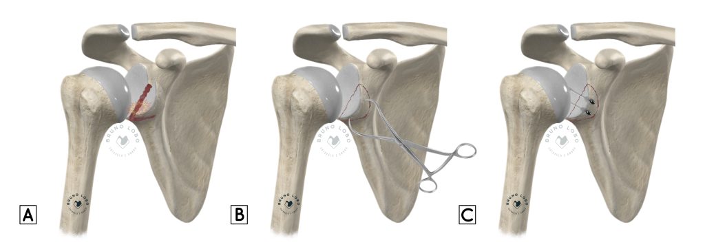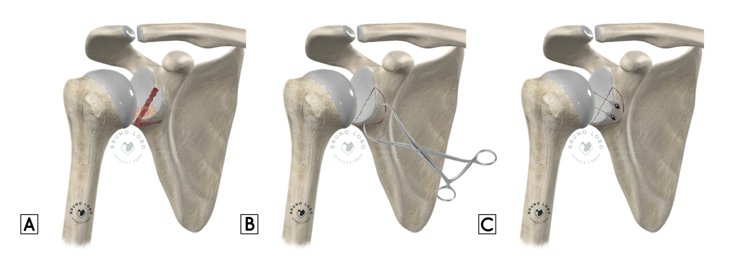 Ilustração mostrando fratura desviada do rebordo anterior da glenóide (A), a redução ciúrgica (B) e a fixação com parafusos (C).