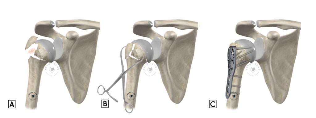 Placa e parafusos: A placa serve como uma ponte, unindo os diversos fragmentos ao seu redor. Alguns fragmentos podem ser fixados com parafusos, enquanto fragmentos menores presos aos tendões do manguito rotador podem ser fixados com amarrilhos que também são presos na placa. Atualmente, a maioria das placas dispõe de algum sistema de fixação entre cada um dos parafusos e a placa. Esse recurso torna o sistema mecanicamente mais estável, diminuindo o risco de soltura.
