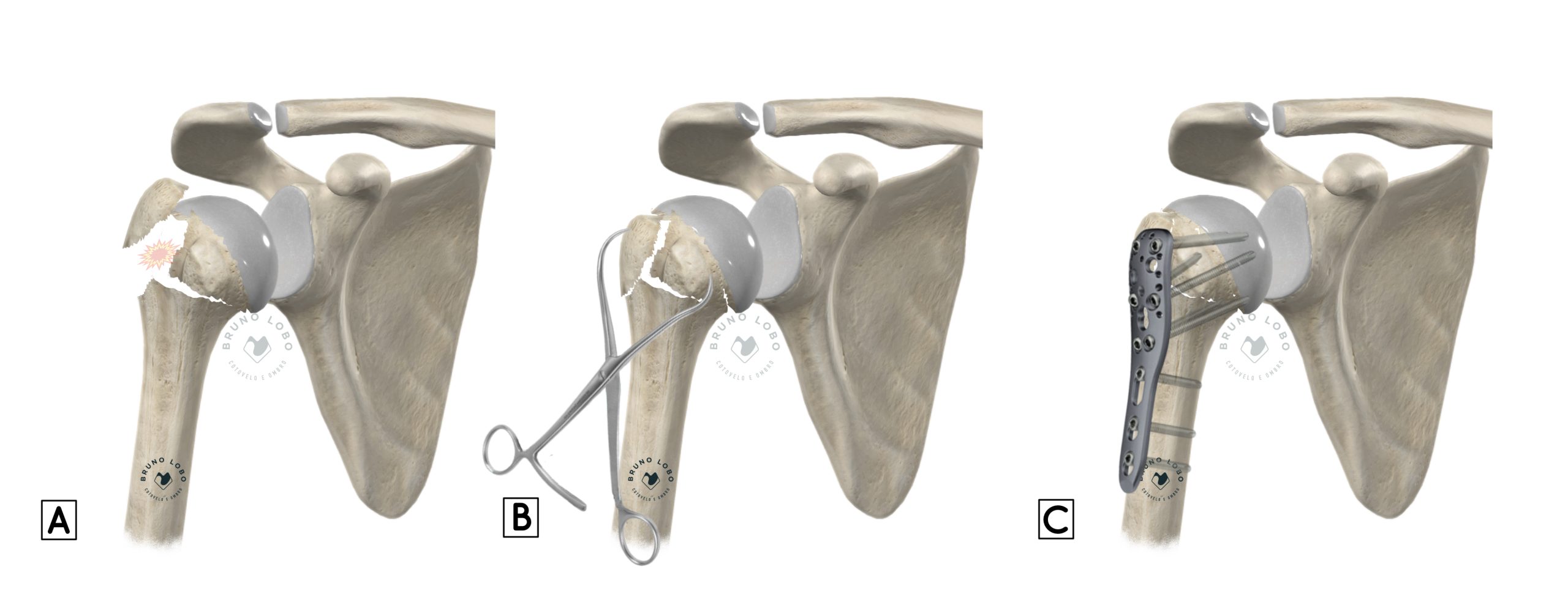 Placa e parafusos: A placa serve como uma ponte, unindo os diversos fragmentos ao seu redor. Alguns fragmentos podem ser fixados com parafusos, enquanto fragmentos menores presos aos tendões do manguito rotador podem ser fixados com amarrilhos que também são presos na placa. Atualmente, a maioria das placas dispõe de algum sistema de fixação entre cada um dos parafusos e a placa. Esse recurso torna o sistema mecanicamente mais estável, diminuindo o risco de soltura.