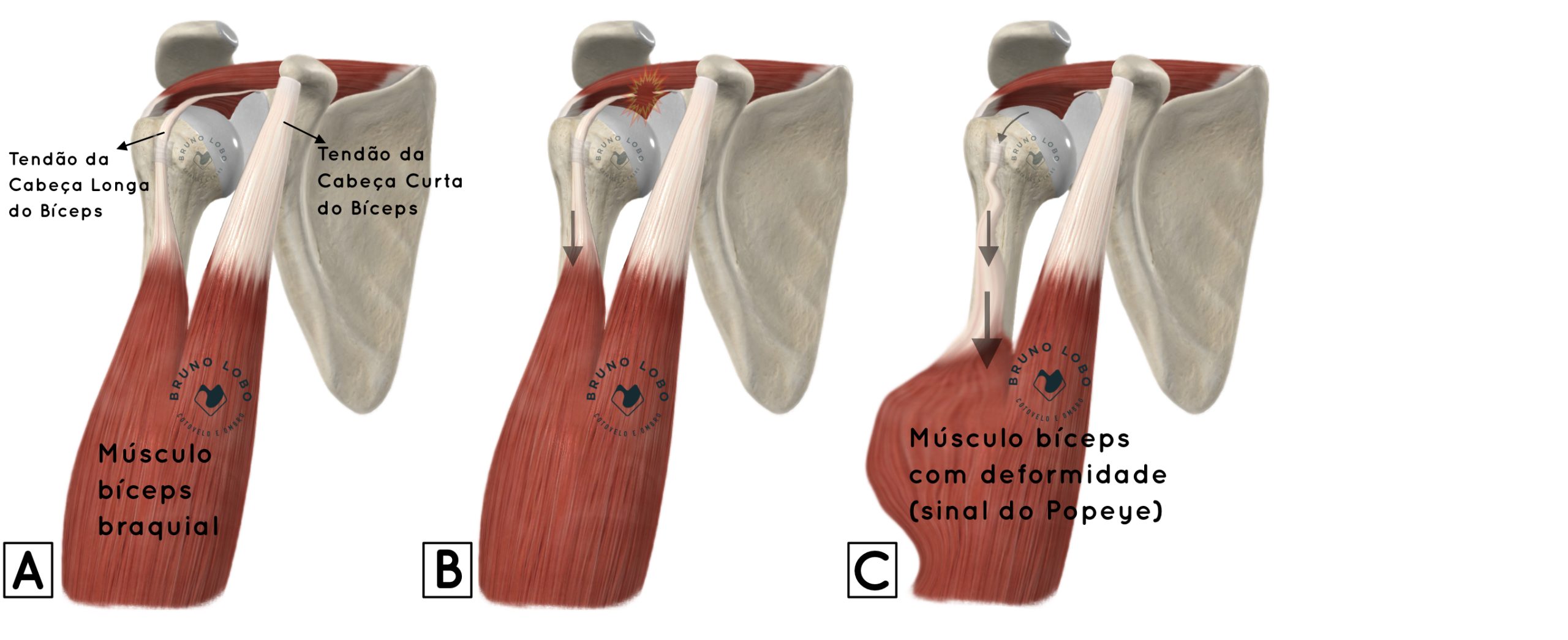 Na ruptura completa, o tendão se dividirá em duas partes. A parte de baixo do tendão é puxada pela musculatura e retrai, gerando uma deformidade na região anterior do braço, que chamamos de sinal do Popeye. Se você romper o tendão do bíceps no ombro, pode perder um pouco de força no braço e sentir dor ao girar o antebraço para que a palma da mão fique voltada para cima (movimento chamado de supinação).