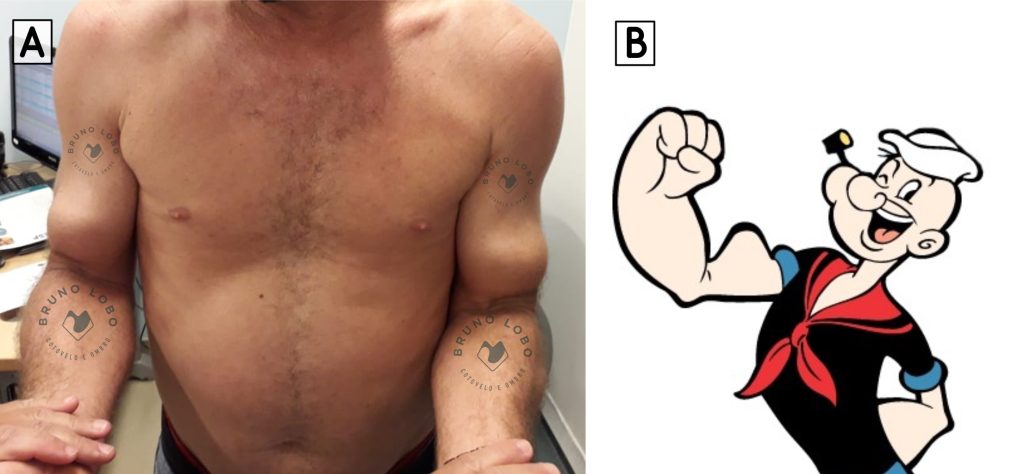 Já na lesão completa isolada do TCLB, o que chama mais atenção é uma deformidade na região da frente do braço, chamada de ‘bíceps de Popeye’, que é causada pela retração do ventre muscular do bíceps. Esta deformidade normalmente permanece e pode ser motivo de grande insatisfação estética. Os sintomas iniciais de dor e inflamação tendem a desaparecer com o tempo, mas eventualmente os pacientes podem se queixar de dor persistente e câimbra na região do bíceps. Dessa forma, o tratamento cirúrgico das lesões do TCLB tem indicação relativa e a decisão deve ser individualizada de acordo com cada indivíduo.