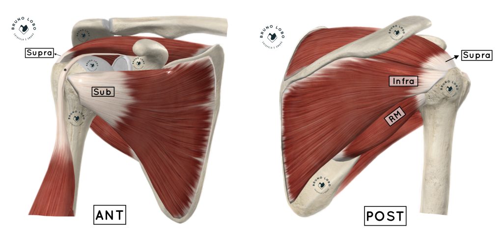 FIGURA: Ilustração mostrando uma visão de frente (ANT) e de trás (POST) do ombro. Os tendões do subescapular (Sub), supra-espinal (Supra), infra-espinhal (Infra) e redondo menor (RM) fazem parte do manguito rotador. O tendão da cabeça longa do bíceps (*) passa entre o Sub e o Supra para se inserir na região superior da glenoide.