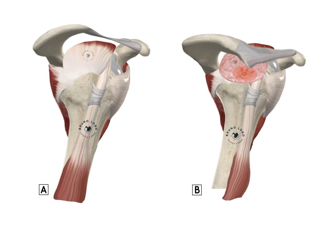 Ilustração mostrando uma visão lateral do ombro normal (A) e com impacto subacromial levando à bursite e tendinopatia do manguito rotador (B).