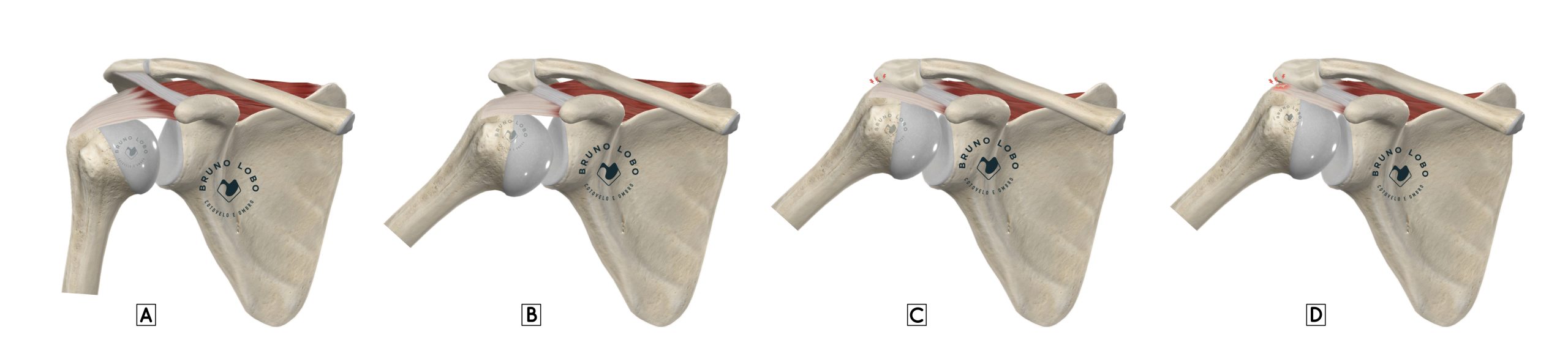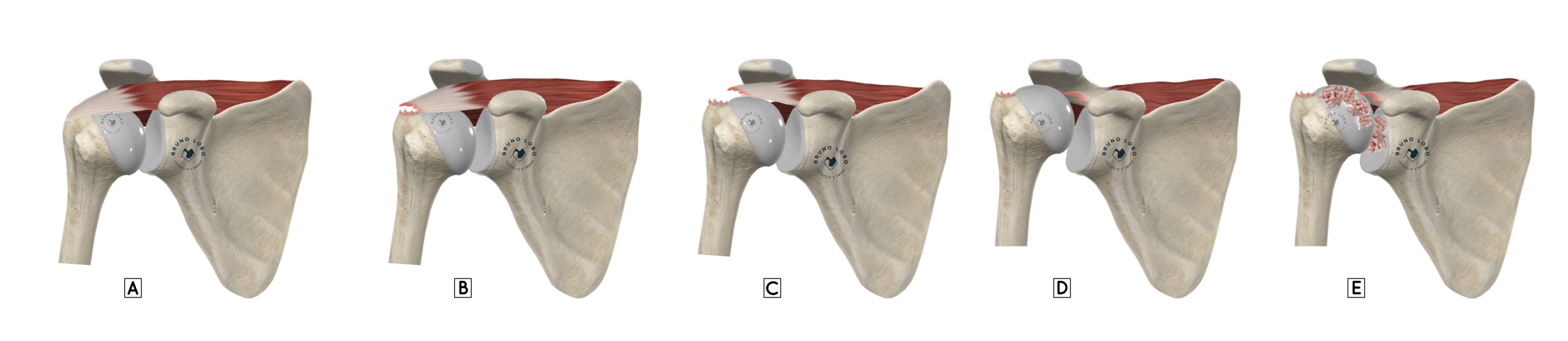 Ilustração mostrando a evolução natural das lesões completas do manguito rotador. Manguito íntegro (A), lesão completa pequena sem retração (B), Lesão completa com retração moderada (C), lesão completa com grande retração(D) e artropatia do ombro decorrente de lesão crônica do manguito rotador (E).