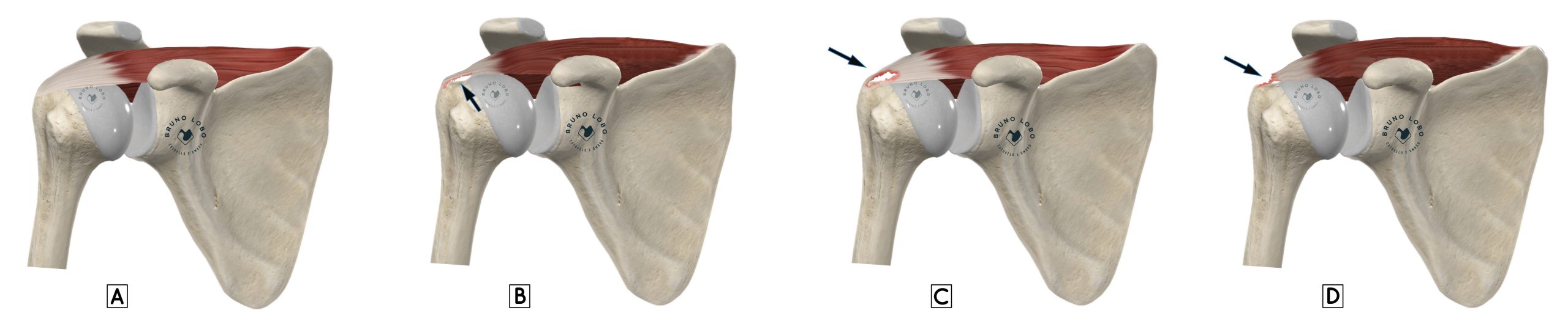 Ilustração mostrando diferentes tipos de lesões parciais do manguito rotador. Manguito íntegro (A), lesão parcial articular (B), Lesão parcial intrasubstancial (C) e lesão parcial bursal (D).