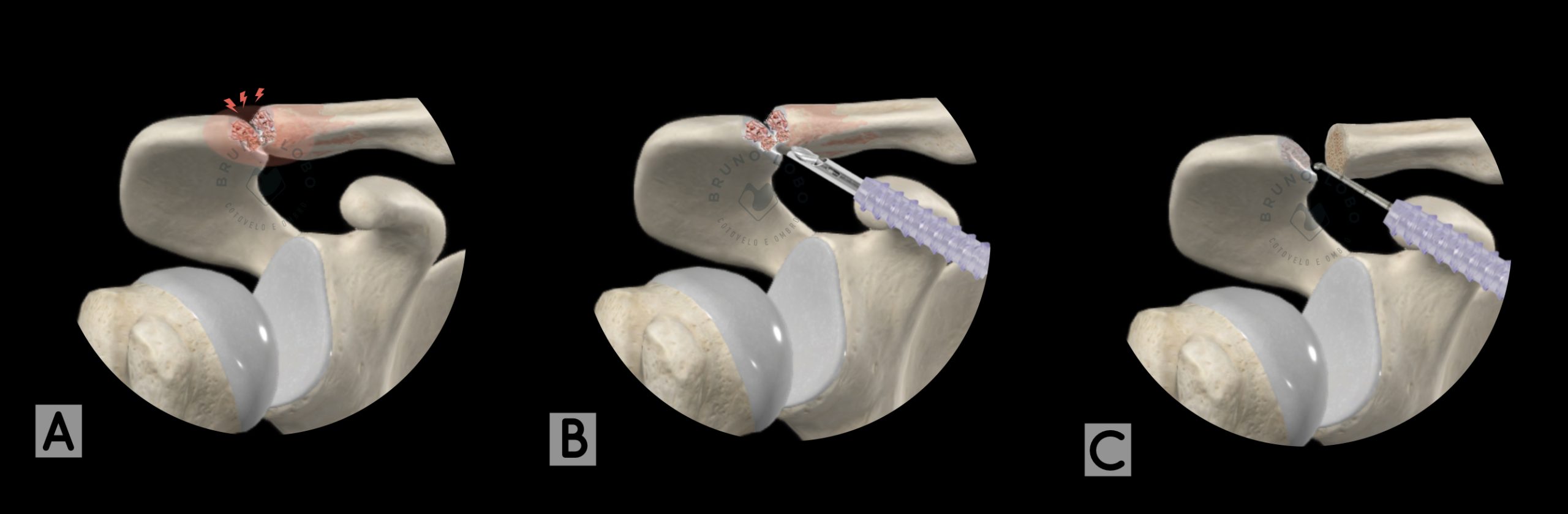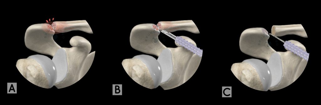 O procedimento é bastante simples e resolutivo. Na cirurgia realizamos a retirada de uma pequena porção doente da extremidade lateral da clavícula, seja por uma deformidade articular e com cartilagem degenerada, no caso da artrose; ou por uma inflamação crônica no caso da osteólise. Para fazer este desbridamento local, utilizamos um aparelho chamado shaver, que raspa e aspira a porção articular degenerada, juntamente com uma ponteira de radiofrequência, que também ajuda fragilizar os tecidos mais resistentes. Dependendo da indicação, podem ser associados procedimentos como a bursectomia e acromioplastia.