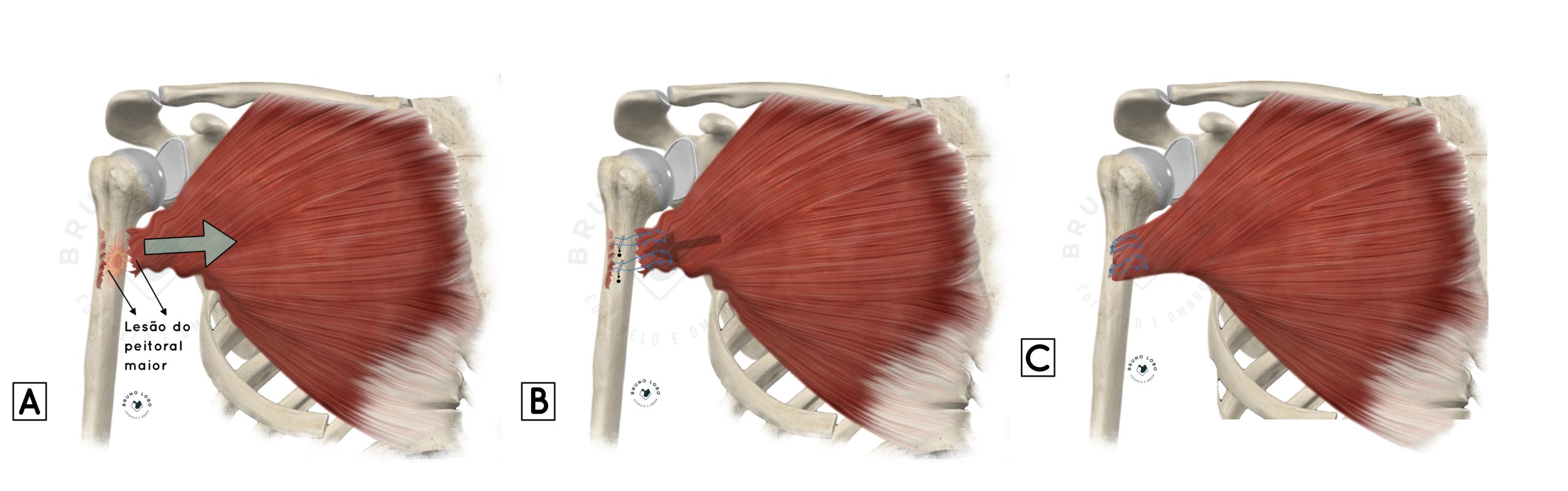 O reparo do tendão do peitoral maior é realizado com um acesso no local de junção entre o braço e o peito. O tendão é localizado, desbridado e reinserido novamente no úmero. Essa fixação óssea do tendão pode ser feita de várias formas, incluindo diferentes dispositivos de fixação, como âncoras ou botões metálicos, ou com túneis ósseos.