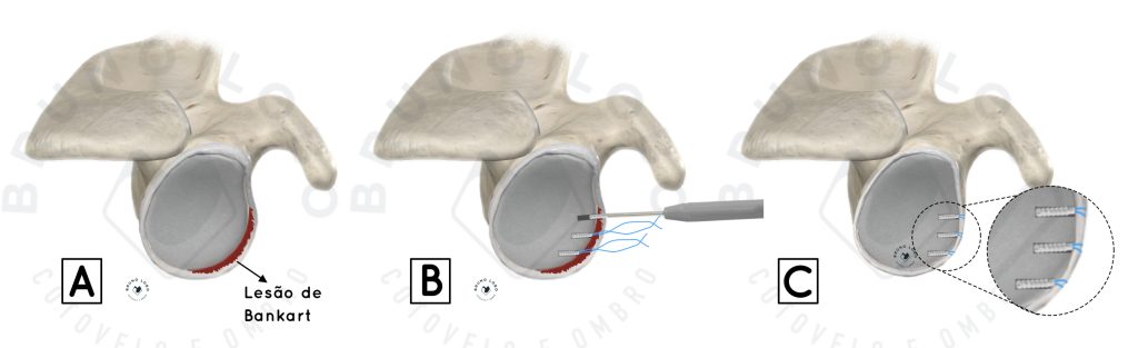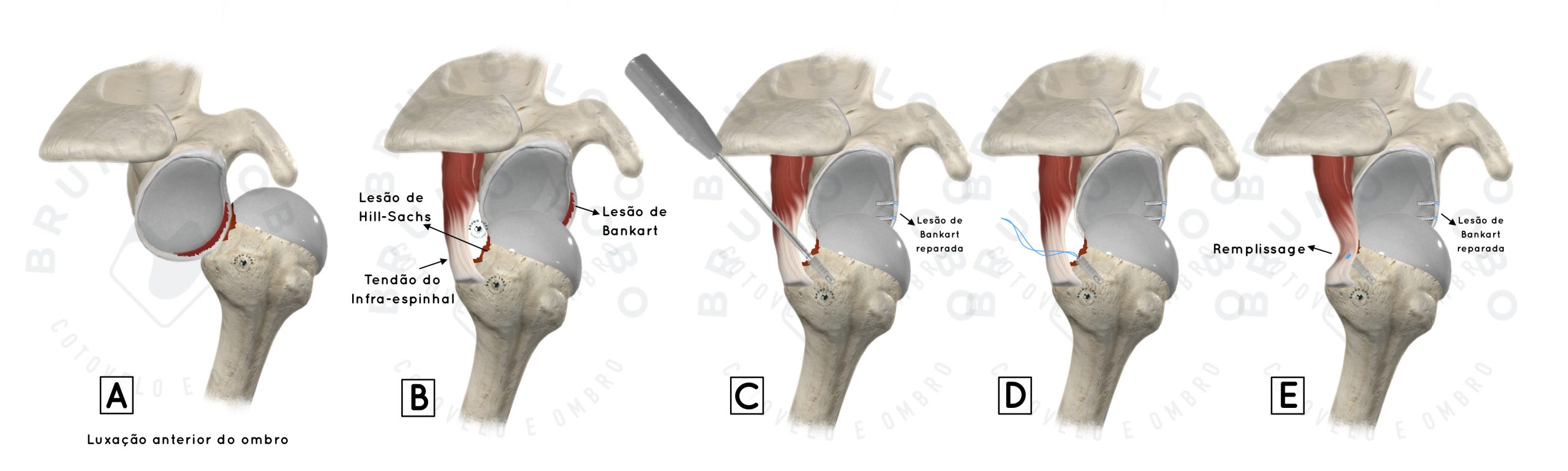 A lesão de Hill-Sachs é um afundamento na cabeça do úmero. Na maioria das vezes, essa lesão é pequena e não contribui para a instabilidade. No entanto, quando a área do Hill-Sachs é extensa, pode contribuir para novos episódios e falha da cirurgia. Nestes casos, podemos associar outro procedimento, chamado de Remplissage, que consiste no preenchimento deste defeito com a própria cápsula articular, que é fixada com uma ou duas âncoras.