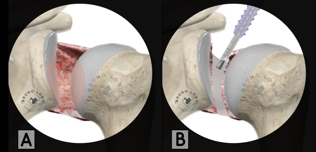 Na capsulite adesiva, o principal objetivo da cirurgia é liberar a cápsula que está muito espessa e sem sua elasticidade natural. Para completar este passo, utilizamos uma ponteira de radiofrequência e uma pinça que resseca as camadas mais espessas da cápsula. São ressecados também locais de tecido sinovial inflamado.